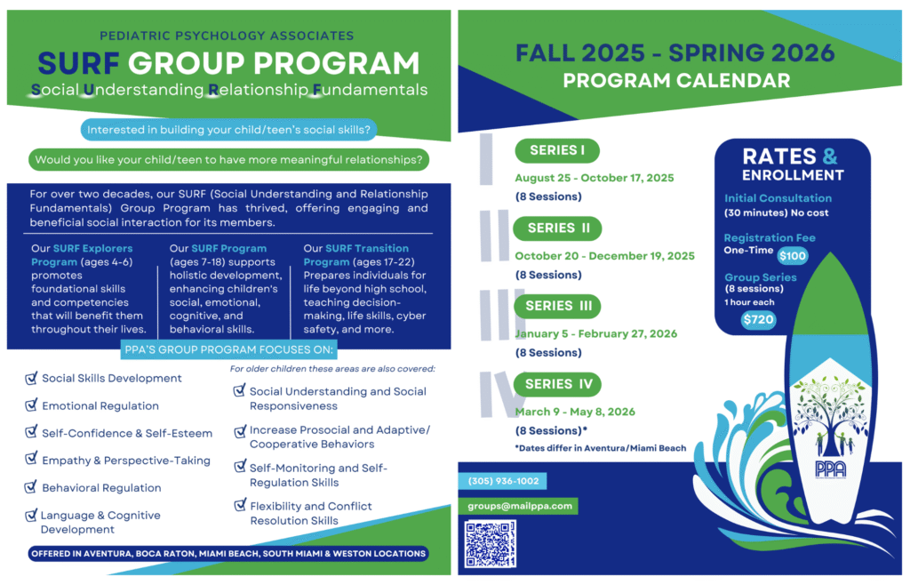 PPA’s SURF (Social Understanding and Relationship Fundamentals) Group Program has been a trusted community partner for over 20 years, providing engaging and impactful social learning experiences for children and adolescents. Using a combination of proven strategies, primarily based on Social Thinking methodology and Naturalistic Developmental Behavioral Interventions (NDBI), our programs provide a dynamic and effective approach to developing and refining social skills. Many families share that their children not only enjoy attending our group programs, but also experience meaningful progress in their social competencies and relationships.